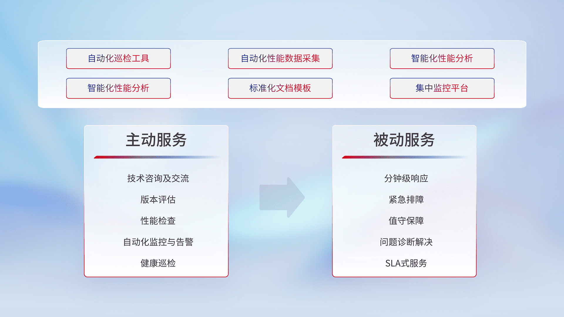智能化工具和标准化文档,,,保障服务质量,,提供主动服务(包含技术咨询、、、、版本评估、、、性能检查、、自动化监控与告警、、、健康巡检)和被动服务包含(分钟级响应、、、紧急排障、、值守保障、、、问题诊断解决、、、、SLA服务)。。。。